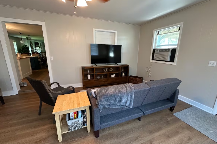 Originally built as an Army barrack for WWII soldiers, this unique 3-bedroom, 2-bath cottage comfortably sleeps 8—with space for up to 10 using the futon and couch.