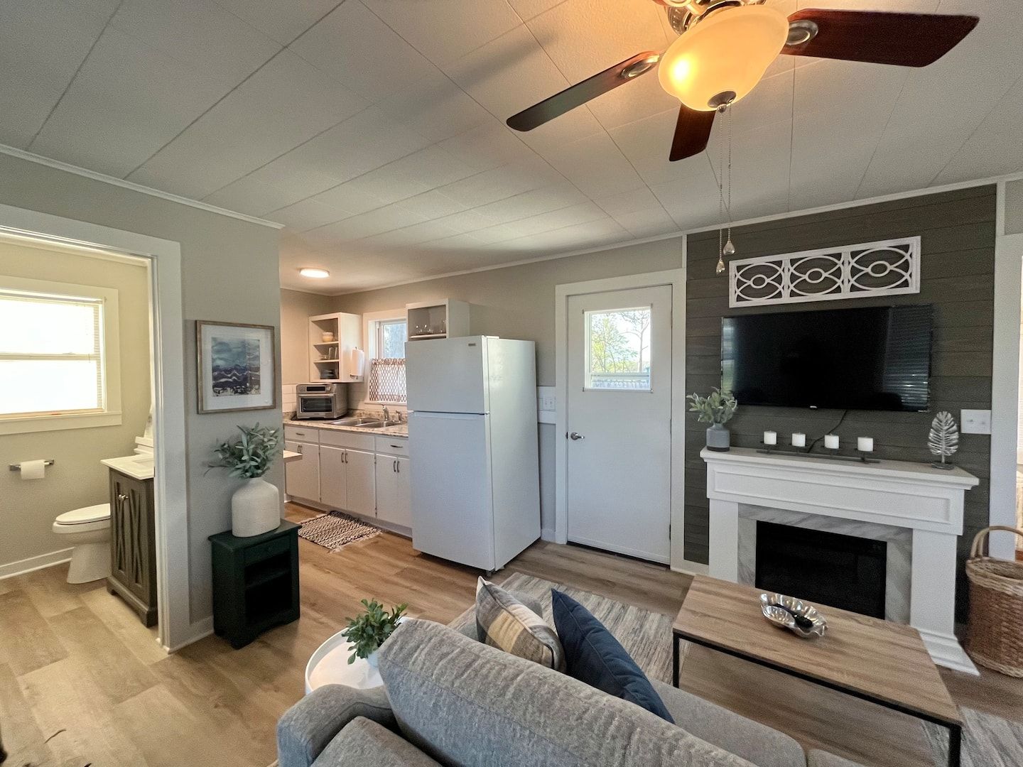 One room efficiency cottage with refrigerator, microwave, air fryer and two cooktops. Bathroom has a pedestal sink, toilet and shower and clothing storage.